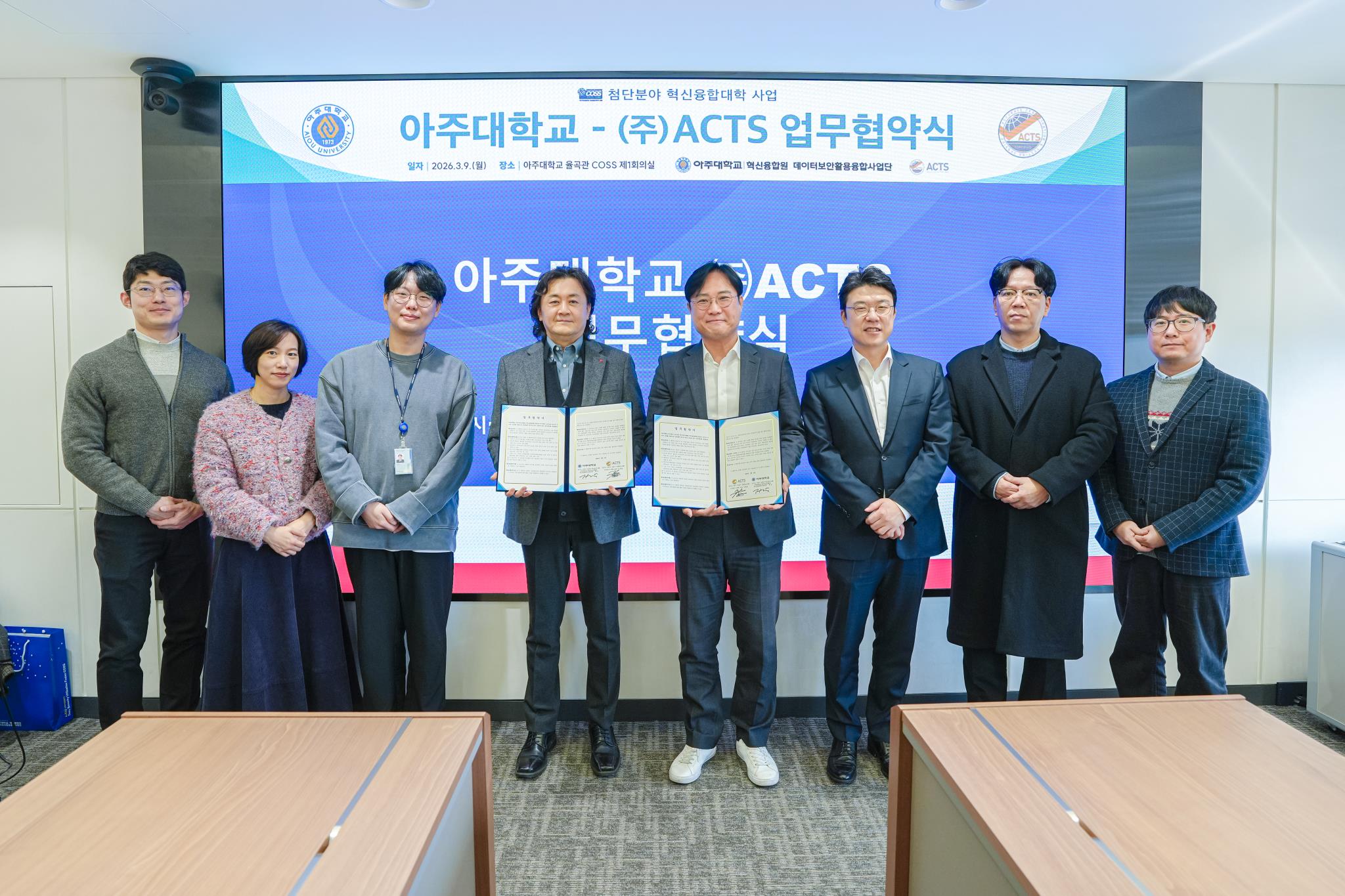 업무협약 체결식은 9일 아주대 율곡관에서 열렸다. 아주대 곽진 데이터보안활용 혁신융합대학사업단(데이터COSS사업단) 단장(위 사진 오른쪽)과 ㈜ACTS 김동율 대표(위 사진 왼쪽)를 비롯한 관계자들이 함께 자리했다.