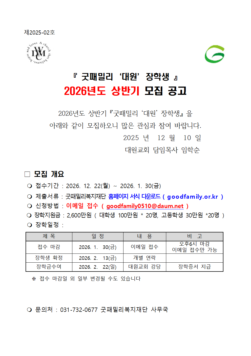 [장학] [교외장학] 2026년도 상반기 『 굿패밀리‘대원’장학생 』 모집 공고