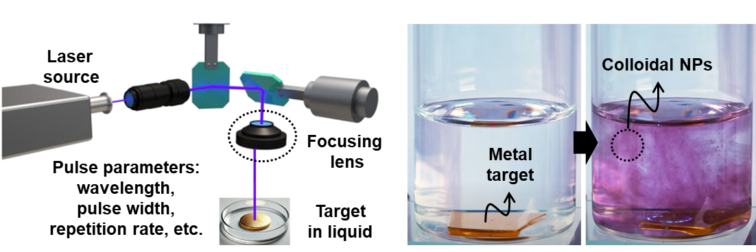 * 위 그림 : 액상 레이저 절삭(Laser abaltion in liquid, LAL) 공정을 통한 나노 입자 제작 및 응용 확장성을 설명하는 이미지