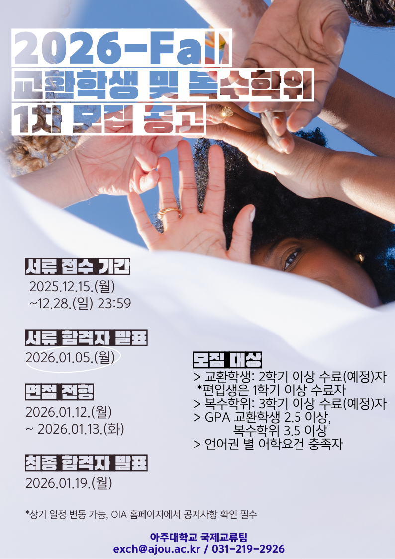 - (1차모집) 26-2학기 파견 교환학생 및 복수학위 선발 요강
